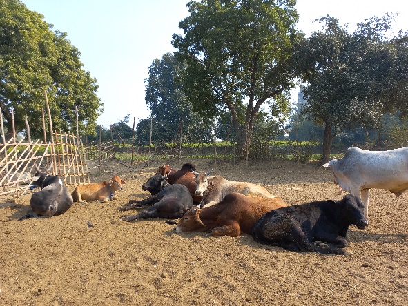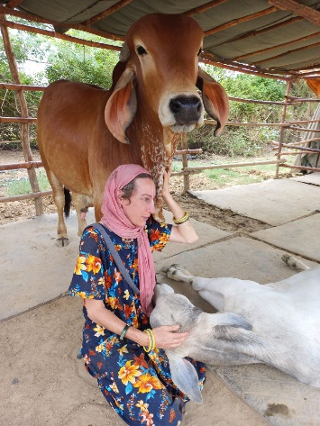 "In der Kuhfürsorge gilt unser Bestreben, den herrenlosen Kühen Vrindavans ein artgerechtes Zuhause zu geben. Wir, das sind meine Person Vrajasevika dd, Ishvari dd und einige Helfer hier vor Ort sowie Unterstützer in Deutschland."