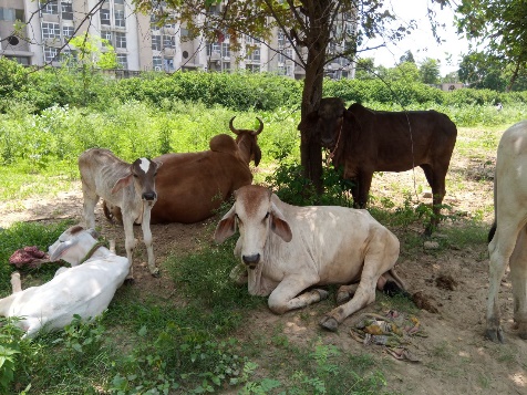"Es sind inzwischen noch ein paar Bullen dazu gekommen. Unter denen die direkt auf dem Feld neben uns wohnen und bei uns essen: eine alte milchlose Kuh Satyabhama, ein junger ausgewachsener Bulle Govinda, ein Kalb Ramanuja, zwei mittelgroße Bullen Vishnu und Haridas."