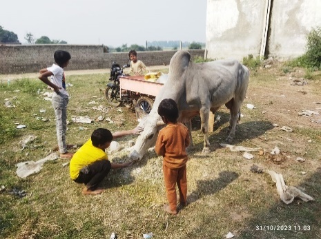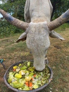 "Wir versorgen auch noch weitere Bullen, die sich in der näheren Umgebung aufhalten aber nicht zu uns kommen können, da sie z.B. zu alt sind oder von den anwesenden anderen Bullen verjagt werden: Es sind Sauri, Gauranga, Jagannath, Krishna, Banvari, Vamshi, denen das Futter per Rikscha an ihre Aufenthaltsorte in der Stadt gebracht wird. Sie bekommen Medizin, Essen und wärmende Decken."